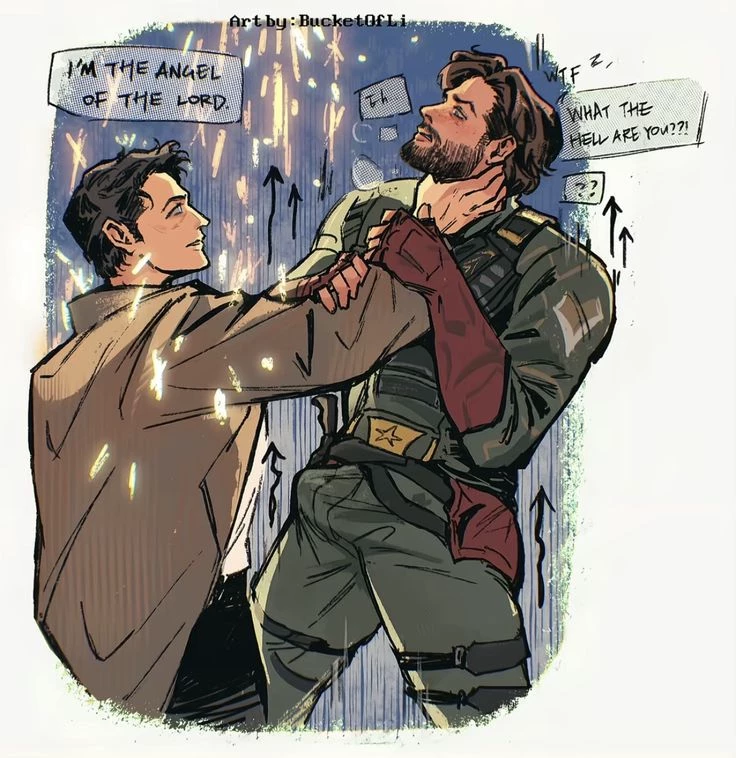 The soldier was waiting at the door, playing with his car keys. In the peeling light of the neon lights of the precinct, his profile was eerily familiar. Castiel has seen this profile thousands of times. In the passenger seat of the Impala. In the reflection of the rear view mirrors. Bent over the body of a killed hunter. Smiling at him with tired tenderness after another end of the world.