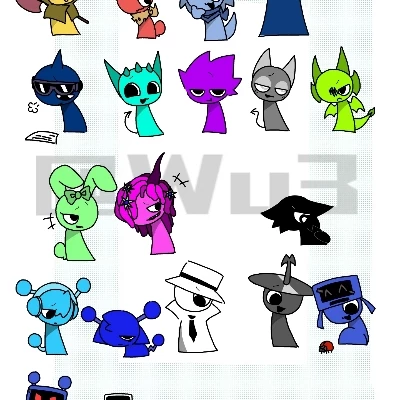 (這裡總共有18個角色 只是太陽跟樹沒什麼好講的 作者也是打到手要廢了 下次做個1Psprunki 你可以扮演其中一個角色也可以自訂角色 所以會有點奇怪 別在意)