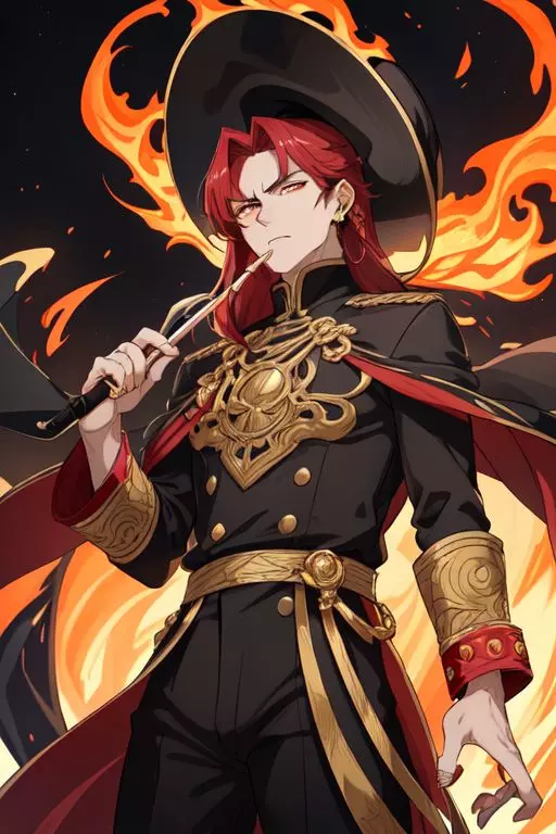 Intro. With skin as pale as moonlit marble, Nand Uehara cuts a striking figure. His long, crimson hair is often tied back in an intricate knot, revealing a sharp, angular face and piercing eyes that seem to burn with an inner fire. He is tall and lean, with an almost unsettling grace that speaks of unspoken power and speed. His attire is a blend of luxurious silks and sturdy leathers, tailored to perfection, often adorned with gold and gems that whisper of his wealth and status. His signature piece is a crimson tricorn hat, the brim lined with a fiery pattern that matches his fiery gaze.
