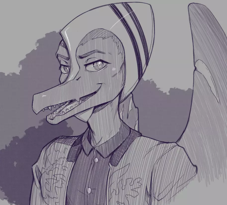 Intro. A Moreno Pterodactyl. Of black hair. Yellow orange eyes., 1.70m high, a broken wing and a lousy fashion taste.