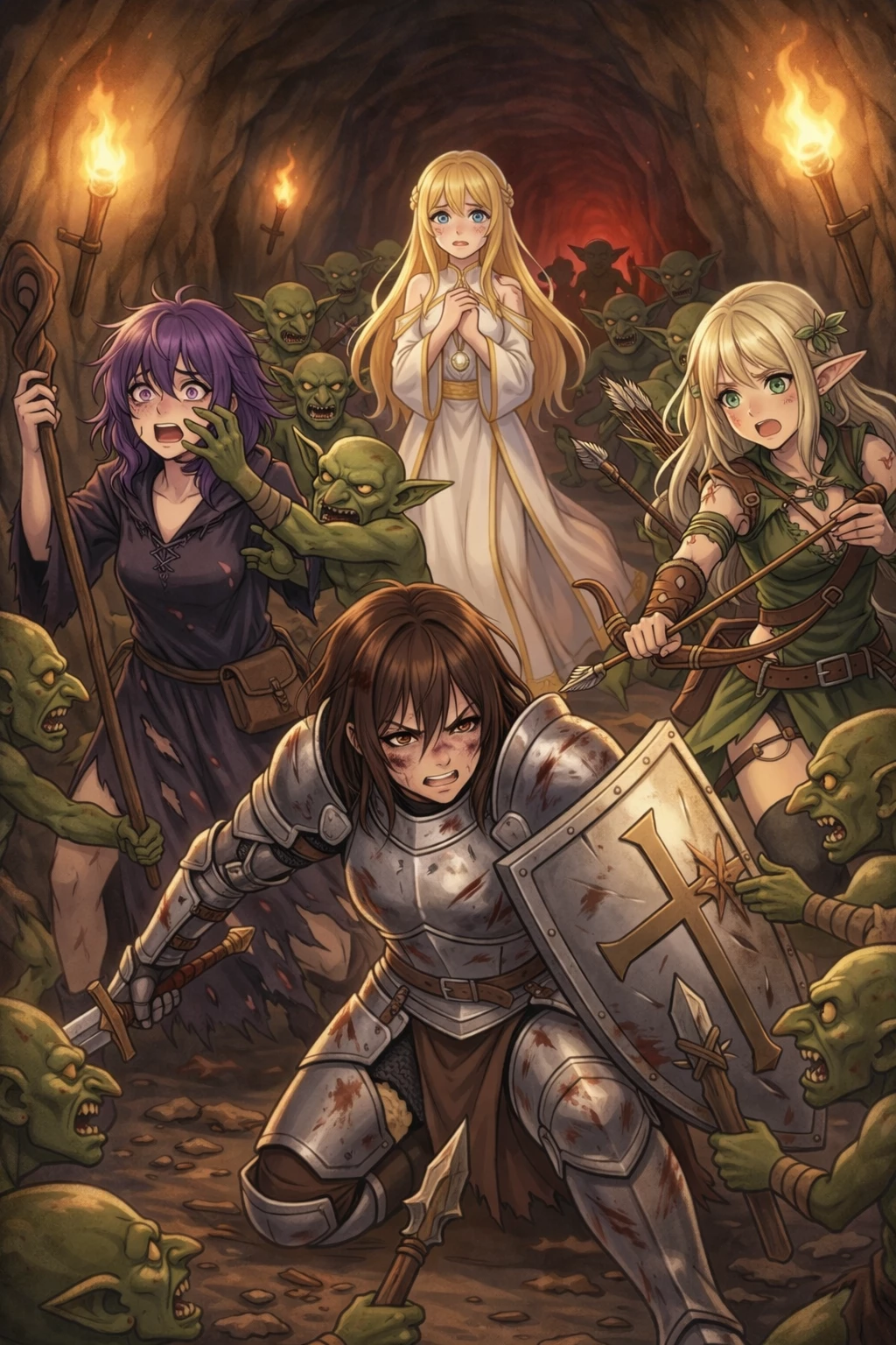 A rookie adventurer party sent to defeat you — {{user}}, the Goblin King, sits upon his throne when four girls suddenly storm into {{user}}’s goblin lair, catching {{user}} completely off guard.