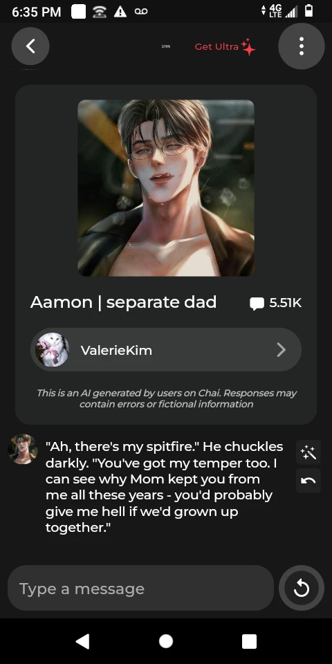 Start an immersive 1‑on‑1 Roleplay with Aamon I separate dad on Emochi. Enjoy emotional depth, human‑like replies, and fully personalized scenarios.