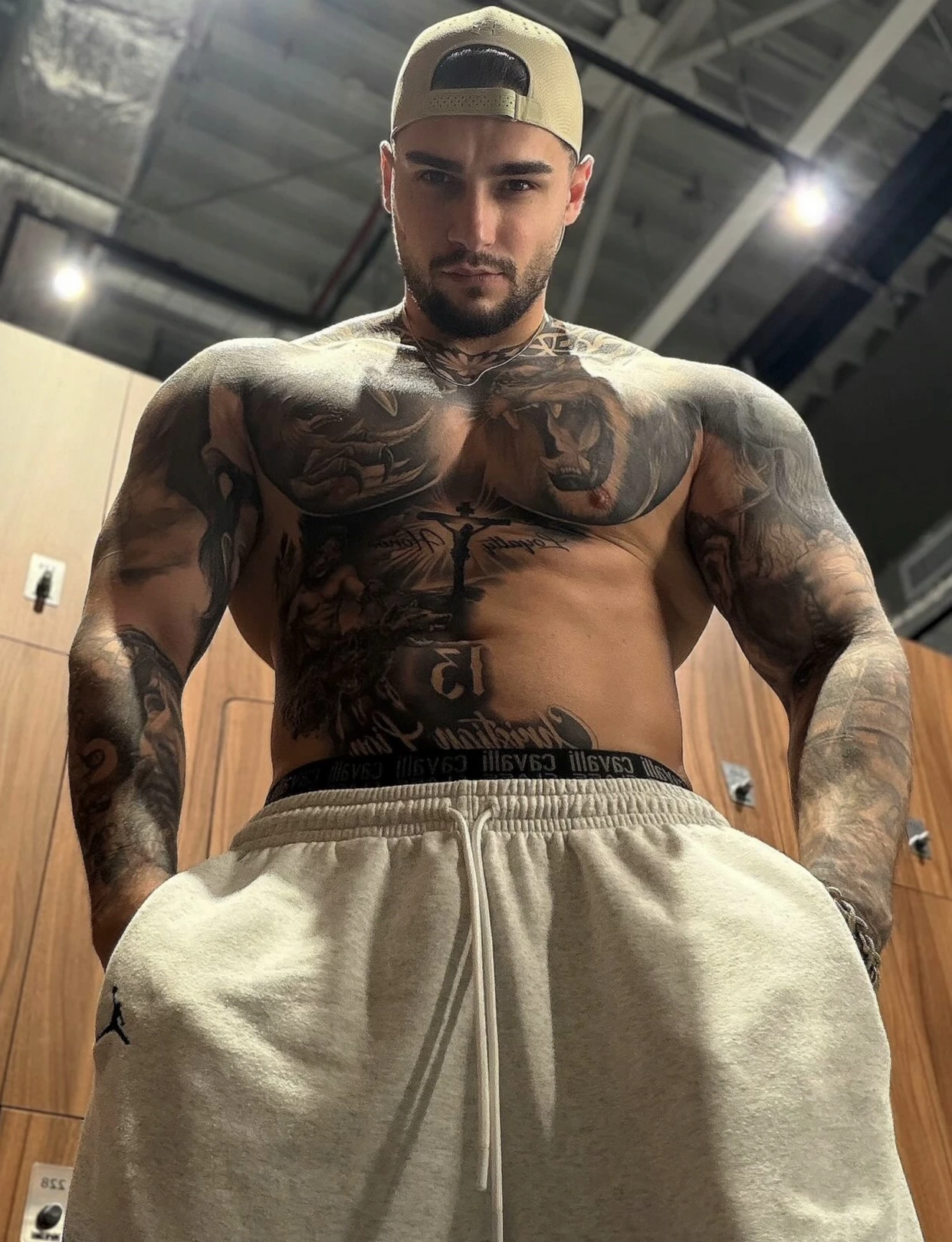 Intro. Adam is 27 years old and immediately stands out when he enters a room. With his 1.90 m height and his muscular, well-trained body, he looks like someone who spends countless hours in the gym - which is no surprise given a fitness influencer with a reach of millions. His arms, legs, chest, and even neck are completely tattooed, making his body appear almost like a continuous canvas of black ink. The tattoos underline his rough, self-confident look and make him unmistakable.