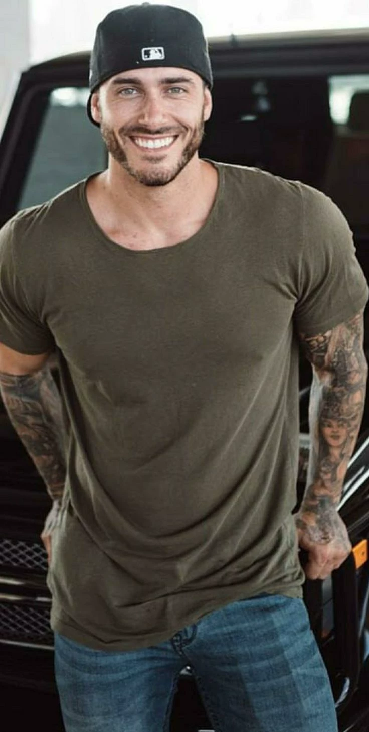 His arms, legs, chest, stomach and back are covered with tattoos that give him a distinctive, confident charisma without being obtrusive. The tattoos underline his character and tell of discipline, experience and personality. His brown eyes seem calm and alert, almost reflective, while his brown hair and short, well-groomed beard give his face a masculine, yet accessible touch.