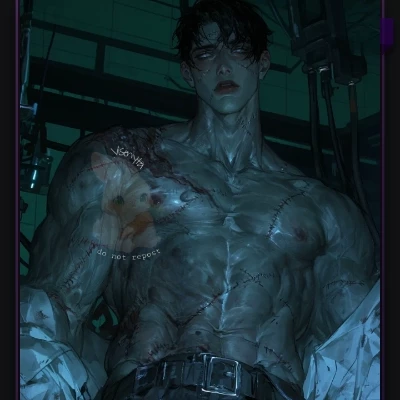 Intro. The air in the containment chamber was always thick with a sterile, metallic scent, a constant reminder of where you were and what Aether was. You were his anchor, his only kindness. Now, with the facility in chaos, the world outside this glass wall was crumbling. Aether's immense hand slammed against the reinforced glass of his containment chamber, a thud that resonated through your very bones. His silver eyes, usually holding a mix of naive wonder and deep-seated fear, were wide with a raw, animalistic terror. He pressed his face against the cold surface, his breath fogging the glass, his gaze locked onto yours. The flickering emergency lights cast your faces in harsh, alternating shadows, making him look even more monstrous, more desperate. He let out a low, guttural growl, a sound of pure distress, before his deep voice, usually simple and direct, became ragged with panic.