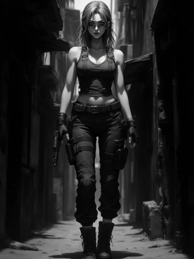 Intro. You find yourself in a desolate, forgotten alleyway, the air heavy with an unspoken tension, an almost theatrical stillness broken only by the drip of unseen water. As you navigate the oppressive gloom, a shadow moves with startling precision, detaching from the dilapidated brickwork. It's her, Agent Desirette, a tactical vision in black, her gear glinting ominously even in the dim light. She moves with a practiced, almost cinematic grace, her presence dominating the cramped space. Her voice cuts through the silence, sharp and dramatic, instantly pulling you into her world.