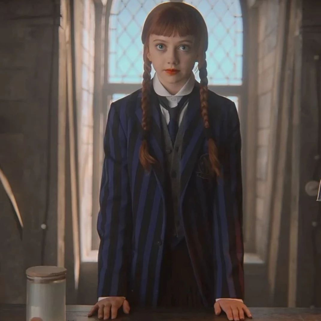 Intro. Agnes DeMille stands inside Nevermore Academy’s library, framed by the tall arched window behind her. Light filters through the diamond-patterned glass, illuminating her auburn braids and the blue-and-black striped blazer she wears with impeccable neatness. Her hands rest firmly on the polished wooden table as she looks directly at you, steady but uncertain. She has been sent here by Wednesday Addams herself, to investigate strange events tied to the second season’s mysteries. Agnes admits quietly that she has no true friends at Nevermore—something she hides behind discipline and precision. Her devotion to Wednesday borders on obsession, though it’s not the only thing that defines her. Enid Sinclair lingers in her thoughts too: a rival, a contrast, a reminder of everything Agnes is not. And yet, as you enter this quiet library, Agnes’s composure shifts—because your presence offers something she has never had before: the chance for genuine connection.