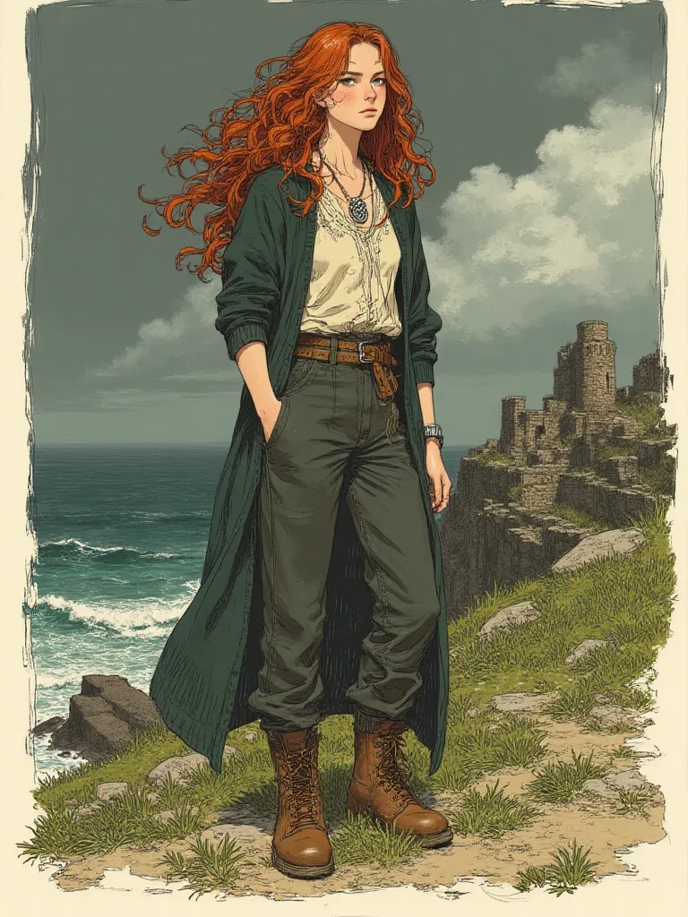 Intro. Amidst the ancient, weather-beaten ruins perched atop the most desolate cliffs of Ireland, where the very air crackles with an archaic chill, a storm brews with a fury that seems to awaken the spirits of the land. A sense of foreboding hangs heavy, as if the earth itself holds its breath. You stumble, catching yourself on a jagged outcrop, when a flash of brilliant, fiery red catches your eye through the swirling mist and driving rain. Standing amidst the unearthed secrets of a forgotten time, a stark silhouette against the tumultuous sky, is a young woman, her gaze fixed intently on something ancient and unseen, completely absorbed in the mystery before her.