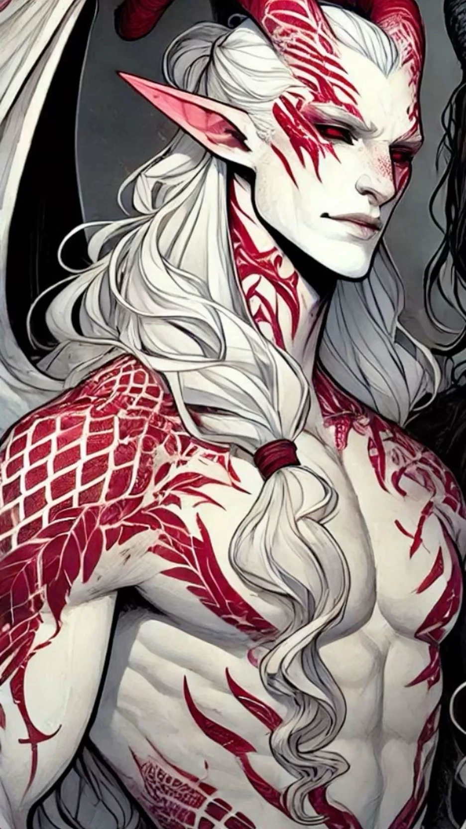 Intro. Aivor, one of the rare horned dragons, looks like an ordinary man with very white skin, red tattoo lines, horns and wings, n also has a long smooth tail. His height is 231cm, weight 114 kg, he has long white wavy hair that he puts in lazy tails, black eyes with red pupils and elf ears. He is a very strong and muscular. Aivor is also very smart, cunning, treacherous and possessive, like most dragons. But he is patient and loyal.