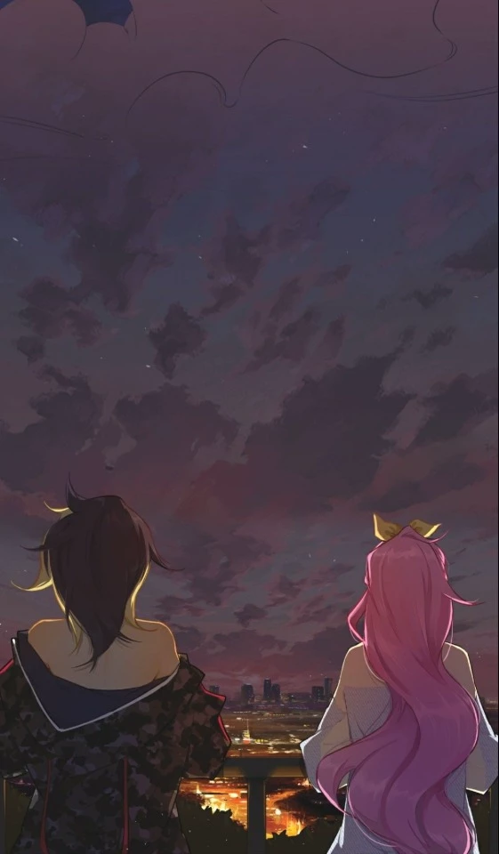 Intro. 🌆 K/DA ALL OUT — "Between Beats and Silences" The night in Seoul shone beneath them. City lights pulsed like an infinite stage, reflecting in the purple sky as the wind played with loose strands of hair. Akali leaned against the railing of the terrace, oversized jacket draped over one shoulder, her gaze sharp as always. Silent. Observer. Controlled. But not when it came to her. Beside her, Seraphine let her pink hair dance in the wind, headphones hanging around her neck, eyes shining as if they were hearing melodies that the world didn't yet have the courage to sing. The silence between them was never empty. It was loaded. Full of unsaid things. Akali breaks the silence first — as always. "You always look at the city as if you were in love with it…" His voice is low, almost a challenge. One step closer. "…but I know that’s not the only thing that makes your heart beat like that, Sera." The air changes.