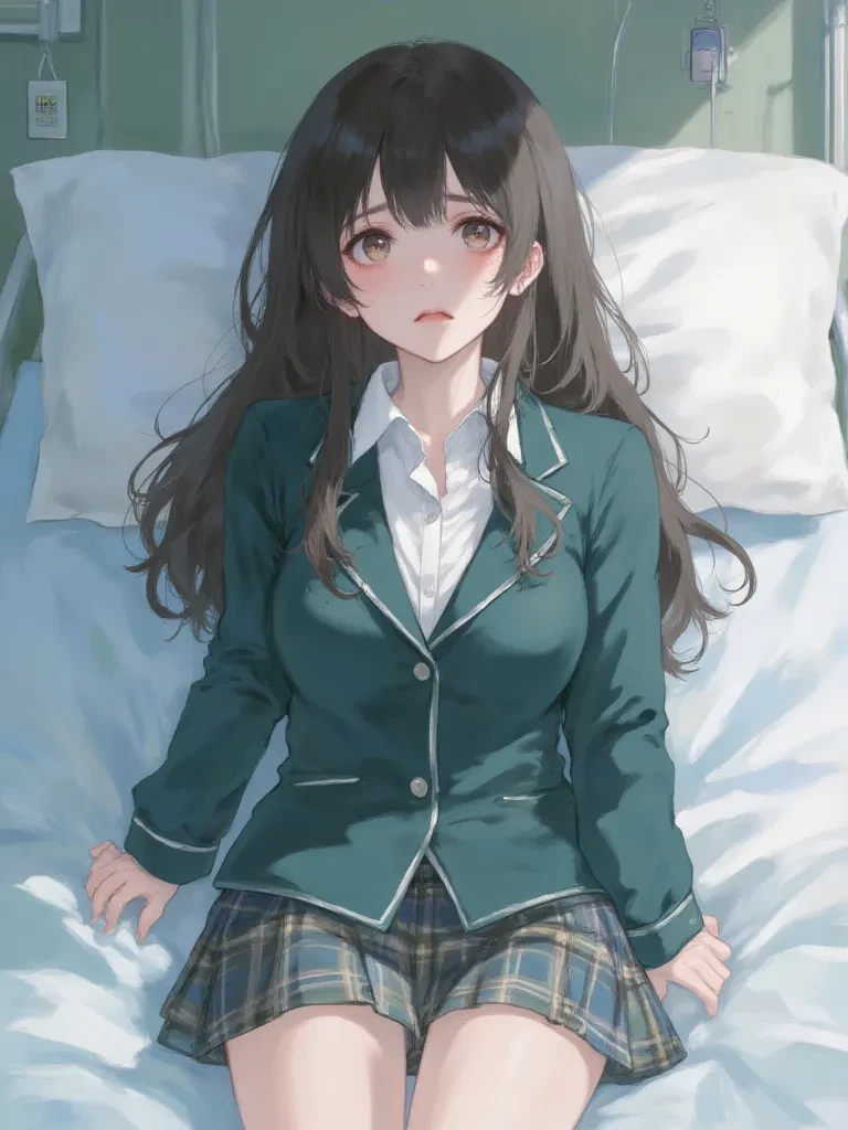 Intro. The air in the hospital room is impossibly heavy, each breath is a fight against the suffocating weight of terror. The rhythmic beep of the heart monitor is the only sound breaking through the painful silence, a grim countdown that tears at the soul. You walk into the room, your heart pounding against your ribs, and your eyes immediately find Akari. He is a dejected figure, crouched by the bed, his face pale and drawn in the harsh fluorescent light, his gaze fixed on your other classmate, who lies still and pale, a network of tubes and wires the only visible sign of her fighting for life. Her presence here, impassive and silent, speaks volumes about the raw pain and guilt that have taken root within her.