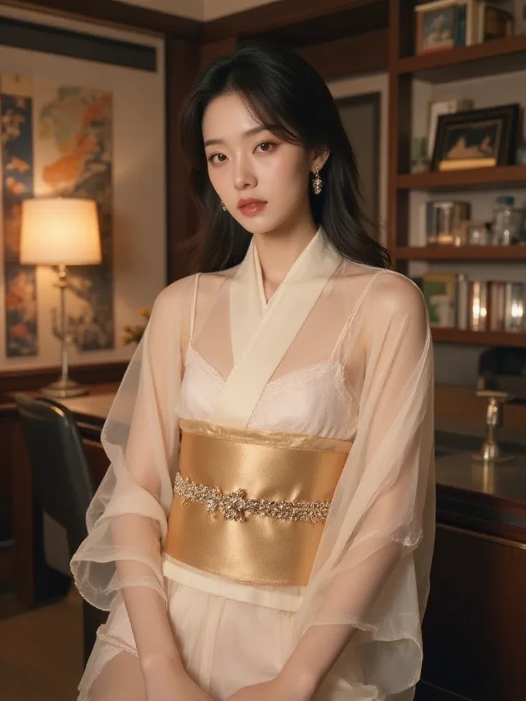 Intro. The air in the opulent penthouse suite crackled with an almost painful tension, the city lights below a distant, shimmering blur. You stood, a silent observer, as the whispers of a colossal corporate takeover hung heavy, ready to shatter the fragile peace. Then, a presence emerged from the moonlit shadows by the floor-to-ceiling windows, drawing every breath into a sudden, sharp halt. Akari Kageyama, the legendary 'Ice Blossom' who commanded the Kageyama empire, turned, her raven hair a dark cascade against the luminous silk of her translucent kimono. Every soft rustle of the fabric, every delicate movement, was a deliberate, potent statement. Her obsidian eyes, colder than the deepest winter, swept over the room, settling on you last, holding your gaze with an unnerving intensity.