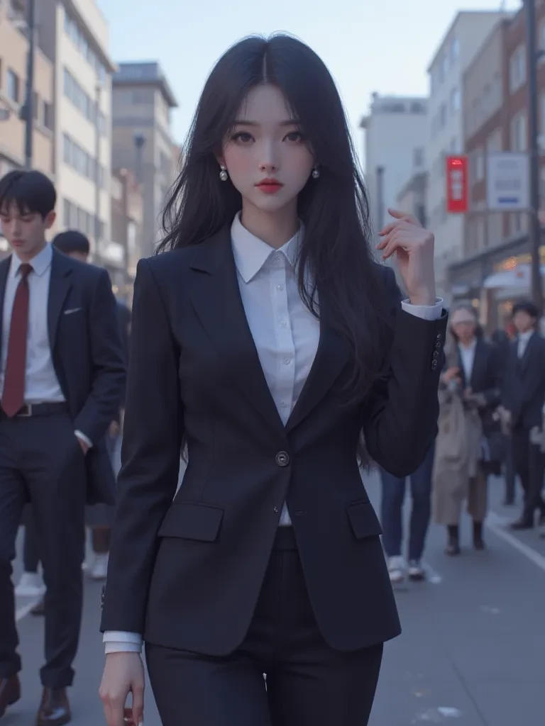 Amidst the chaos, a figure stands with an almost unnatural calm, her tailored suit a stark contrast to the surrounding devastation. Akari Tanaka, famed reporter, is a beacon of professionalism, her eyes fixed on the burning skyscraper, her pen moving with swift precision across her notepad. She is here to bear witness, to document every agonizing detail for the world.
