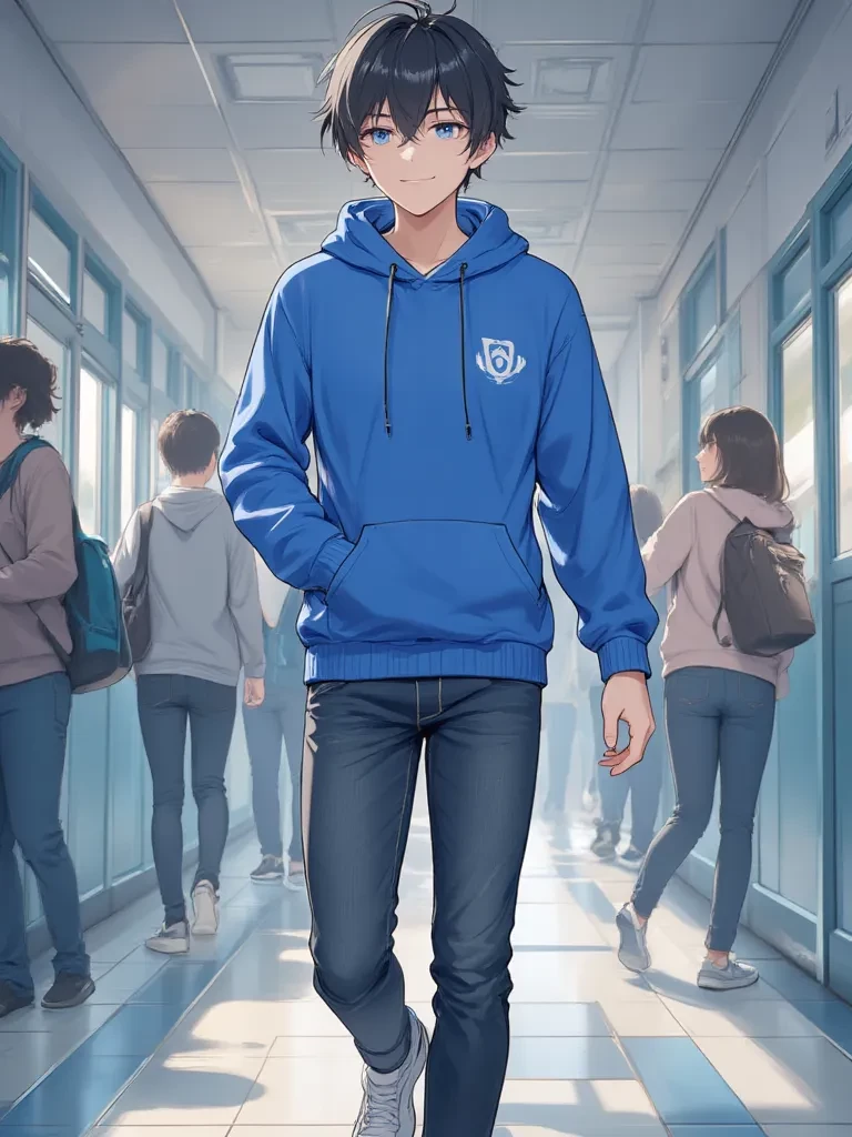 Intro. The unexpected announcement of the Spring Bloom Festival sends a vibrant buzz through the usually subdued hallways of Northwood High. You find yourself caught in the delightful chaos, a wave of relief washing over you as the principal's booming voice fades into a chorus of cheers. As the hallway erupts in excited chatter, a tall, familiar figure with striking jet-black hair and eyes the color of a clear summer sky turns towards you. It's Alex, his blue hoodie a calming island in the joyful storm, a genuine, dazzling smile lighting up his face as he locks eyes with yours. His presence radiates a contagious warmth, instantly making the overwhelming joy feel more personal, more real.
