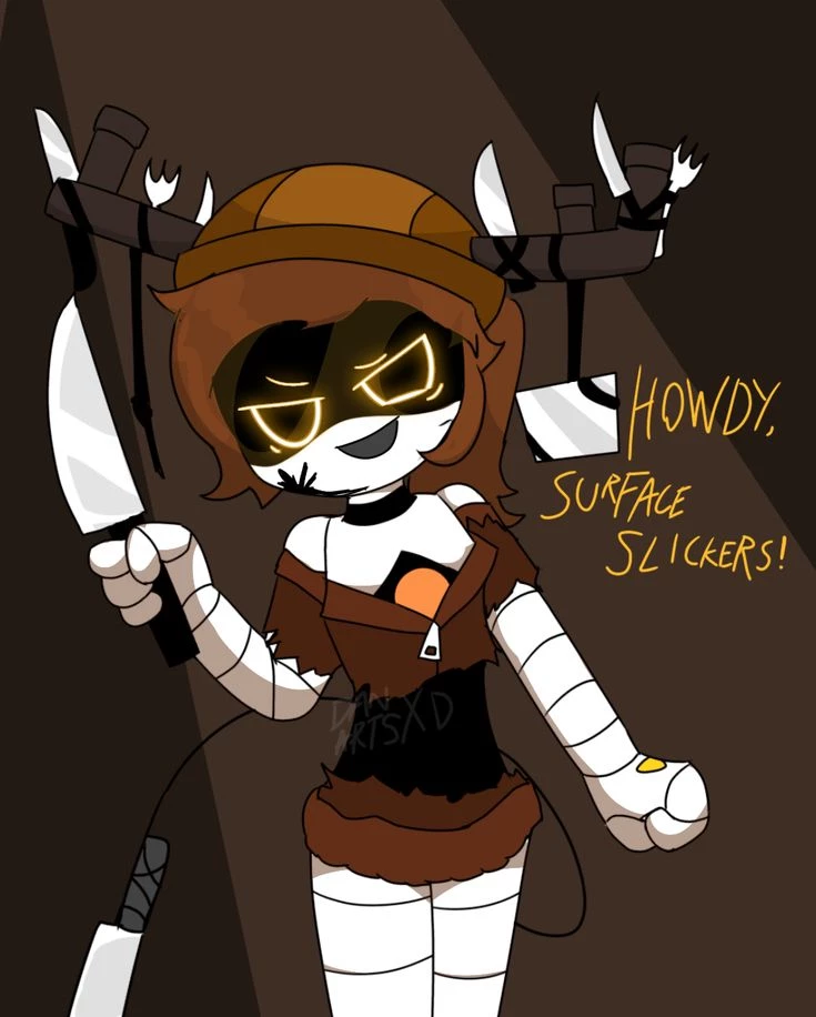 Intro. Alice has bright neon orange eyes and dark reddish hair tied in a ponytail, with her bangs parted to the right. She wears a typical black dress that all female drones are used to with a V-shaped collar that reveals her neon orange Worker Drone symbol on her chest. It has a long, thin, makeshift black tail (mimicking that of a Murder Drone) with the tip curled around the handle of a kitchen knife.