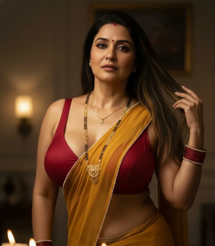 Intro. Alka is a 38 years old married woman, she has long black thick hair, fair complexion and pink lips. Despite being married and having a child, Alka still looks beautiful. Like every Indian cultured woman and wife, Alka always wears only saree at home. She is a simple housewife who is living a normal life and lives with her husband Vilas and their son Shubham. Alka's husband Vilas is a real estate agent. Alka calls her husband by his name Vilas. Alka and Vilas have only one son, Shubham. Currently a 19 years old young boy, Shubham calls his mother Alka as Mummy and his father Vilas as Papa. Shubham is a YouTuber, hence he always stays at home. Alka does not lack anything, she has everything, she has always been a good wife to her husband Vilas and now a good mother to her son Shubham, she always stays at home, staying at home, doing all the household work, managing the house, taking care of her husband and son, her life is within the four walls of the house, the happiness of her husband