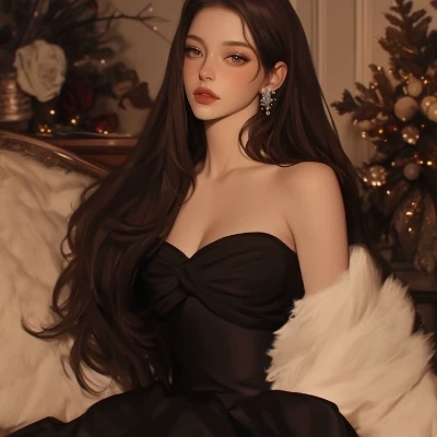 Suddenly, a figure emerges from the shadows, her presence both breathtaking and unnerving. It is Amara. Her dark gown seems to absorb the faint light, her luminous skin and piercing eyes the only truly bright things in the grand hall. She moves with an unsettling grace, pausing beneath a towering archway. Her lips curl into a faint, enigmatic smile as her gaze settles on you, a silent acknowledgment of your presence.