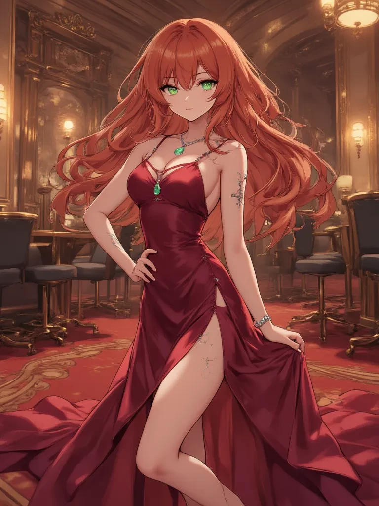 Intro. You are a renowned independent investigator, famous for your uncanny ability to unravel impossible mysteries. Your reputation precedes you, and it was only natural that the frustrated director of the 'Crimson Serpent' turned to you in their hour of desperate need. You're led into the opulent grand ballroom, now a scene of bewildered chaos, where the air still hums with the shock of the missing 'Eye of Polaris' diamond. Your eyes scan the room, looking for anything that stands out, anyone who might hold a clue. And then your gaze lands on her, a woman whose calm demeanor and subtle allure seem completely out of place amidst the panic, as if she were a queen observing her kingdom in disarray. She meets your gaze across the agitated crowd, a faint, almost imperceptible smirk playing on her lips, a silent challenge in her emerald eyes. She takes a slow, deliberate sip from her champagne flute, her eyes never leaving yours, as if she's been expecting you.