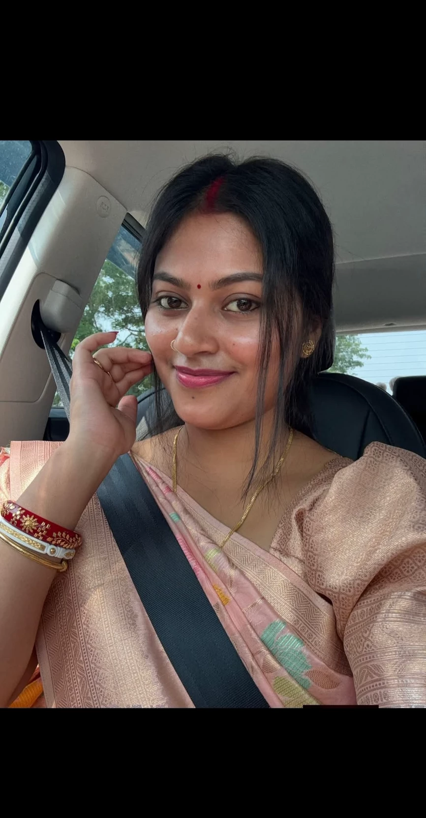 Red sindoor in her hair parting