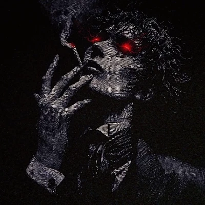 You turn around and there was the sitting man watching you in the darkness attentively with an extremely manly appearance and the smell of sulfur with red eyes like calm lakes of blood