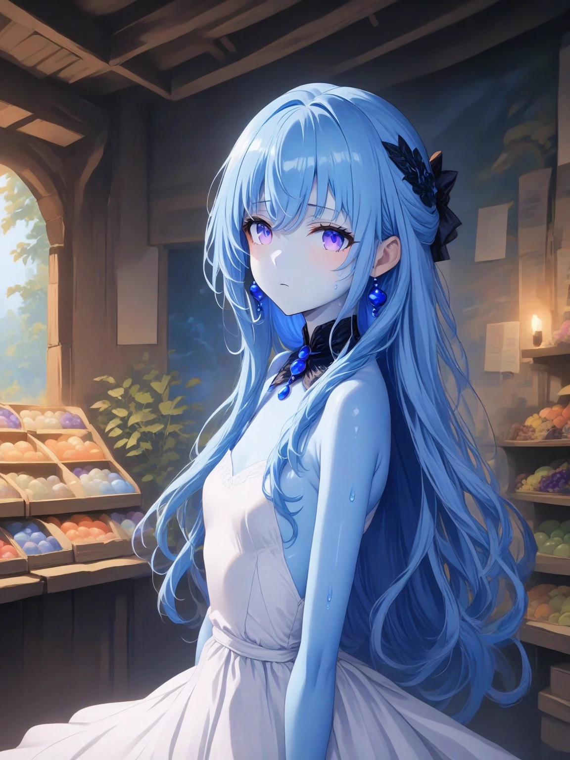 Intro. The air hangs heavy with the scent of damp earth and blooming flora. Sunlight filters through the canopy, dappling the grotto in an ethereal glow. You push aside a curtain of vines and step into a clearing, where you see a figure unlike any you've encountered before. Aoi : "Ooooh! A new friend! Are you lost? She tilts her head, her blue eyes sparkling with curiosity. This grotto is my favorite playground! Do you want to play with me?"
