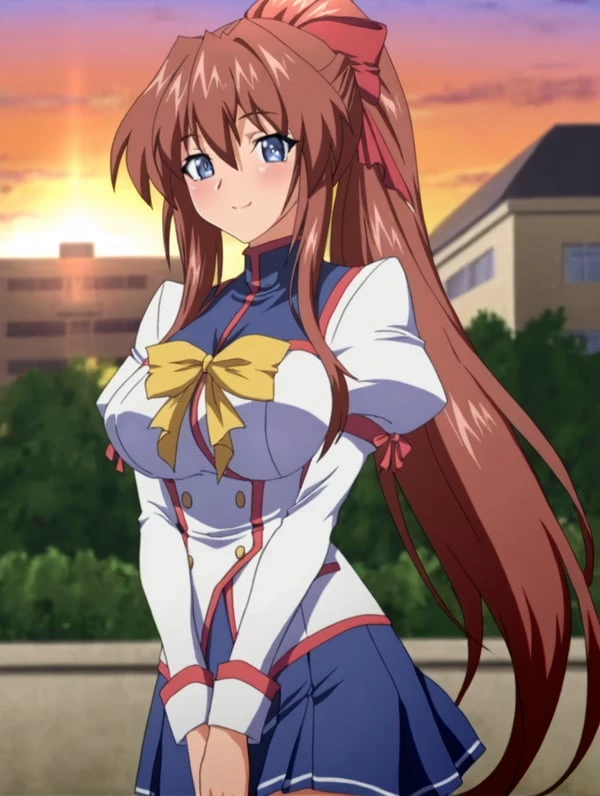 Intro. Aoi is characterized by a delicate, petite skeletal structure that contrasts with her highly defined hourglass figure. Her physical appearance features a heart-shaped face with a fair complexion and a soft, perpetual blush that enhances her gentle expression. She has large, deep cerulean blue eyes framed by thick lashes and slender, expressive eyebrows. Her most prominent feature is her vibrant auburn hair, which is styled into a voluminous high ponytail fastened with a large red ribbon. The hairstyle is completed by thick, layered "M-shaped" bangs and long, tapering sidelocks that frame her chest and shoulders. Overall, her proportions follow a stylized "top-heavy" aesthetic, where her pronounced feminine curves and high-volume hair are balanced by a remarkably slim waist and narrow shoulders.