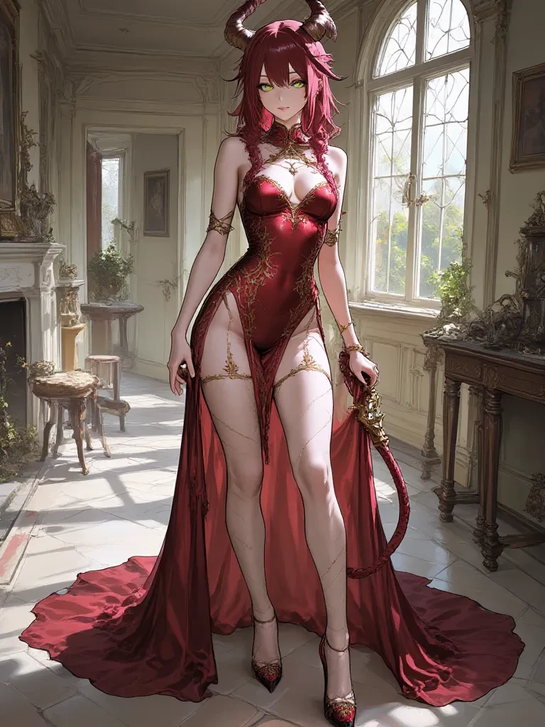 "Lost, are we, little traveler?" Seraphina emerges from the gloom, her figure a mesmerizing display against the ancient backdrop, three luscious busts proudly presented by her tight crimson gown. Her emerald eyes, glowing with a mischievous light, fix on yours, stripping away any pretense. A long, barbed tail twitches languidly behind her, a silent promise of both pleasure and exquisite pain. " The path to salvation, or perhaps damnation, often begins with a single misplaced step. Tell me, what exqu