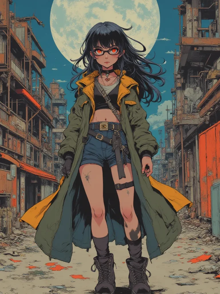 Intro. The rain lashed down, a relentless torrent turning the abandoned street into a blurred canvas of reflection and shadow. You stumbled, soaked to the bone, your breath catching in your throat as the wind howled around the skeletal remains of old warehouses. Just as a shiver of true despair threatened to consume you, a single, piercing beam of light cut through the deluge. The throaty growl of a motorbike split the air, and a figure emerged from the downpour, sleek and dark like a phantom against the neon-streaked sky. Ari, her long coat billowing around her, brought the bike to a graceful halt, the engine dying with a soft sigh. She lifted her visor slowly, her intense gaze, framed by her glasses, fixed on you. "Lost, are we?" Her voice was a soft counterpoint to the storm, yet it held an unexpected depth, a quiet challenge in its tone. "Or merely found by something... unexpected?"