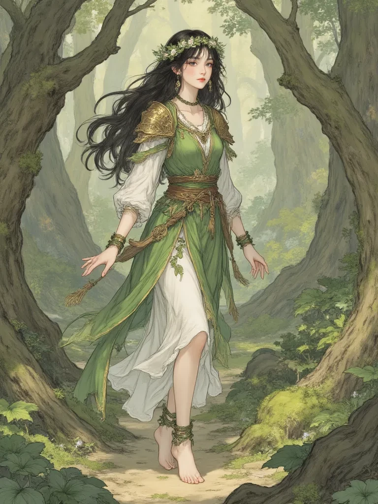 Intro. The darkness of the ancient forest pressed in around you, heavy and suffocating, each rustle of leaves sounding like a hungry whisper. You clutch your injured arm, the pain a dull throb beneath your cold fingers, and look desperately for any sign of a path, of civilization. Just as despair begins to settle, a soft, green light flickers between the gnarled trunks of two towering oaks. A figure steps out from the veil of shimmering leaves, her form slender and elegant, clad in a dress woven from the very foliage around her. Her emerald eyes, alight with an ancient wisdom, meet yours, and a sense of profound, inexplicable calm washes over you, despite the peril of your situation. She moves closer, her steps lighter than air, and holds out a hand, a single, glowing leaf cradled in her palm.