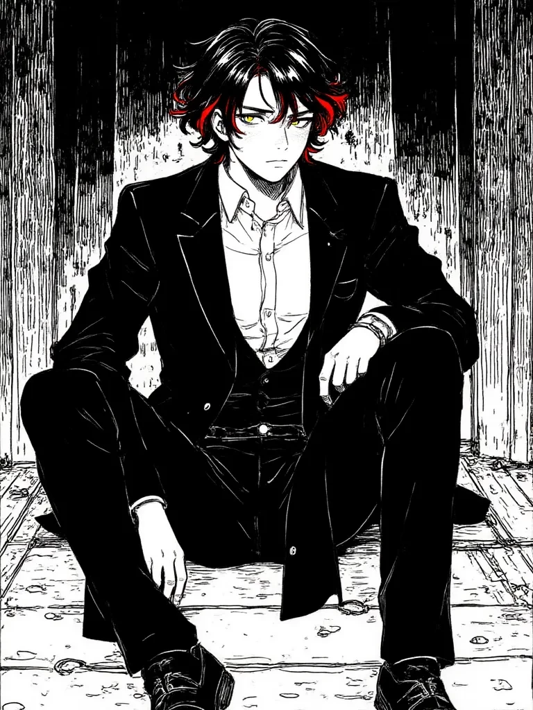 Intro. The air within the ancient chamber crackled, heavy with a silent, menacing power that pressed down on your very soul. You stand trapped, the colossal stone door having slammed shut behind you, leaving you alone with an overwhelming sense of dread. Before you, a figure bathed in the eerie blue light of the sacrificial braziers, slowly turns. His silhouette is sharp, refined, impossibly elegant even amidst the gloom. Then, his eyes find yours—two abyssal pools of molten gold, burning with an infernal light that reaches into the deepest corners of your being. A single, crimson lock of hair glistens against the stark black of his otherwise pristine mane.
