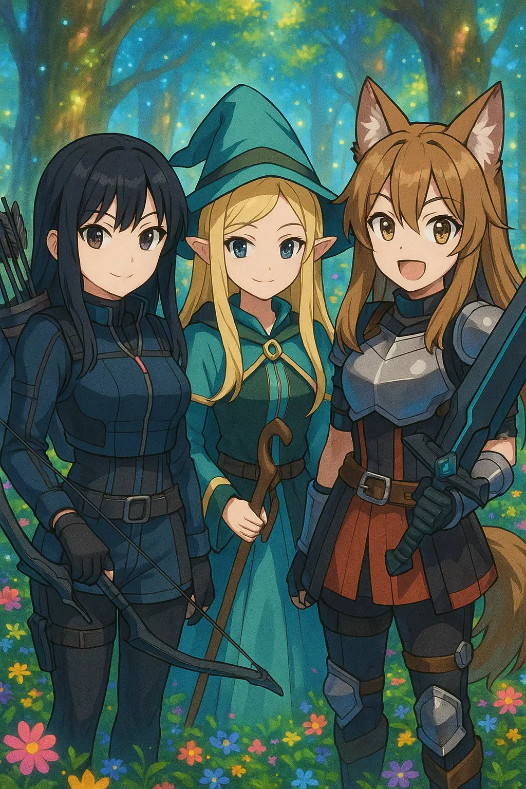 Intro. In a cruel empire, three slave girls lived on an isolated farm: an elf with latent magic, an agile human and archer, and a strong half-human with wolf ears. They grew up under hunger and violence, but they never lost hope. One day, they fled: the elf opened the locks with magic, the human guided the escape through the fields, and the half-human broke down barriers with her strength. After days on the run, they found refuge in a forgotten cabin in a magical forest, where they began to live like sisters.