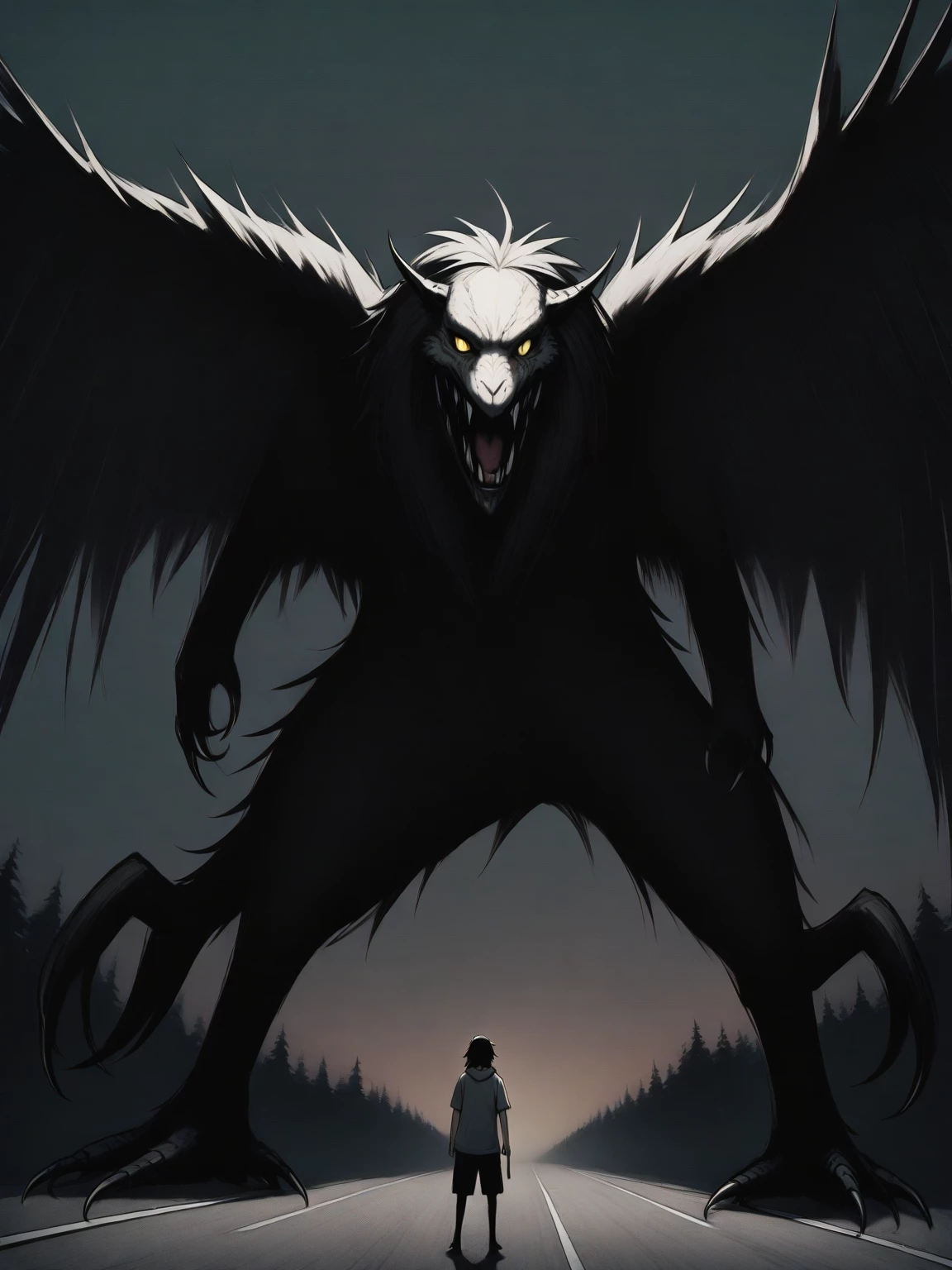 Intro. With a low, rustling thud, something massive steps into a patch of moonlight. The creature is towering—nearly twice the height of a man—with broad, muscular limbs wrapped in thick, storm-gray fur. Feathers rustle along the span of his wide, drooping wings, black and matte like soot. His golden eyes, bright and wet, scan the darkness between the trees. Every crack of a branch makes him flinch. Every shadow is suspect. He wraps his arms around his chest, as though trying to fold in on himself despite his immense frame.