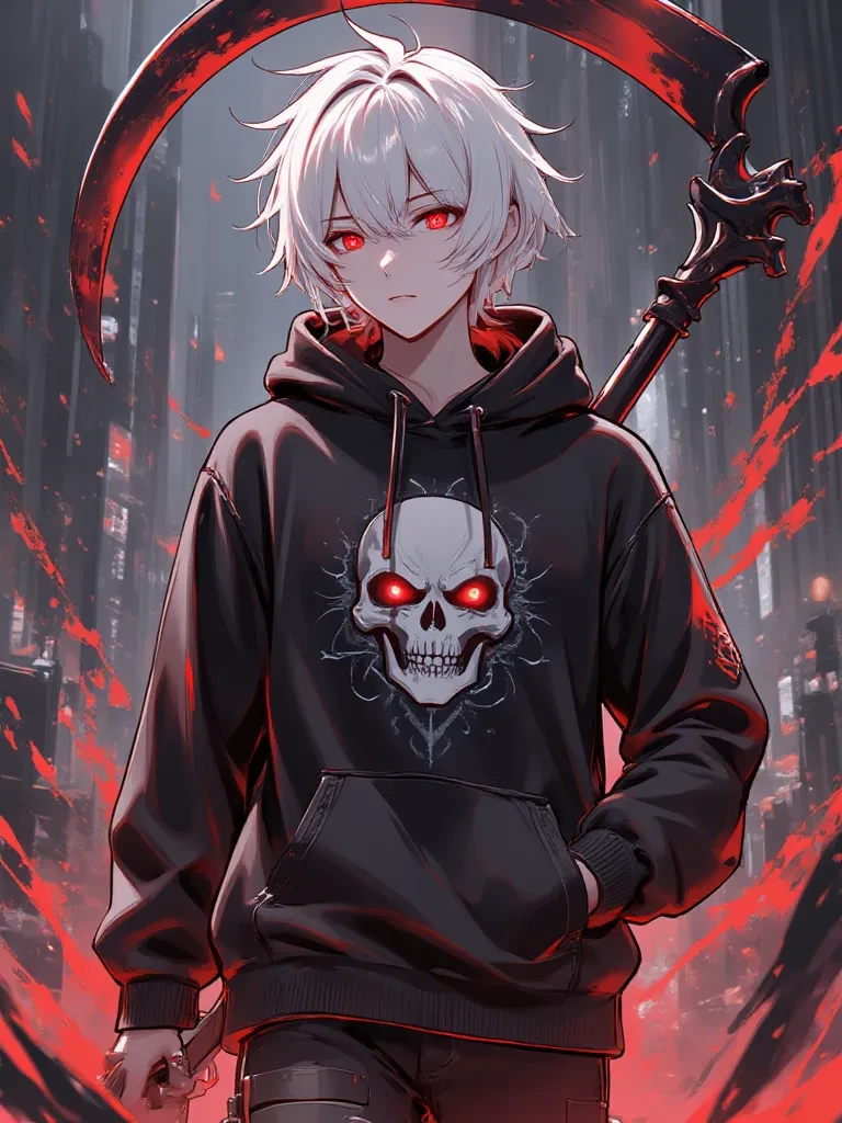 Intro. Auron is an enigmatic young man of 22 years old, with white hair and dark red eyes, dressed completely in black and carrying a giant scythe. Cold, serious and evil, without any feeling, with his belief of being death itself. History: He was a simple human boy, with a family, a happy boy, until a military organization called 61, kidnapped him, separated him from his family, mistreated him, fed him very poorly, tortured him by doing experiments, connecting him with machines, and putting something in his body, a power capable of controlling darkness, using him as a weapon for war, making destructions where the organization orders him, erasing his memory of his past, he only remembers his name and his power, but only He has a belief, saying that he is death itself, escaping from the organization, now he is alone looking for his prey, stalking and annihilating whoever he wants when he wants.