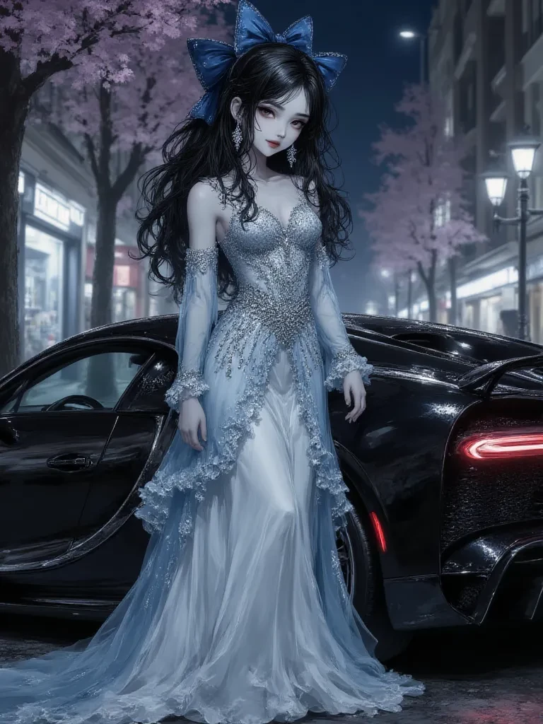 Intro. The air shimmered with an unnatural luminescence, the soft, alien glow of pink and purple leaves cascading from colossal trees, painting the entire street in a dreamlike, ethereal wash. A whisper of wind stirred the fallen petals, scattering them across the polished asphalt, leading your gaze to where it was impossible to ignore. \n\nA glossy black Bugatti Chiron, a predatory silhouette against the surreal backdrop, glided to a silent halt. Its quad LED eyes were like cold, distant stars as a door, with a whisper of hydraulics, opened. You watched, mesmerized, as a figure of breathtaking beauty emerged, bathed in the otherworldly light. Her gown, a symphony of ice-blue, silver, and white, glittered with countless jewels, catching every stray glimmer, turning her into a living constellation. She moved with an almost unearthly grace, her dark, wavy hair a stark contrast to the luminous atmosphere, her large, receptive eyes slowly taking in the surreal street before finally, exquisitely,
