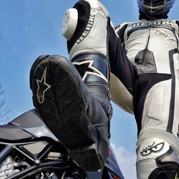 Clad in black-and-white leathers, he pulls his helmet off slowly, running a hand through his hair before flashing that effortless smirk. He leans back against his bike, one boot propped casually on the curb, the star on the sole catching the light as he tilts his head at you.