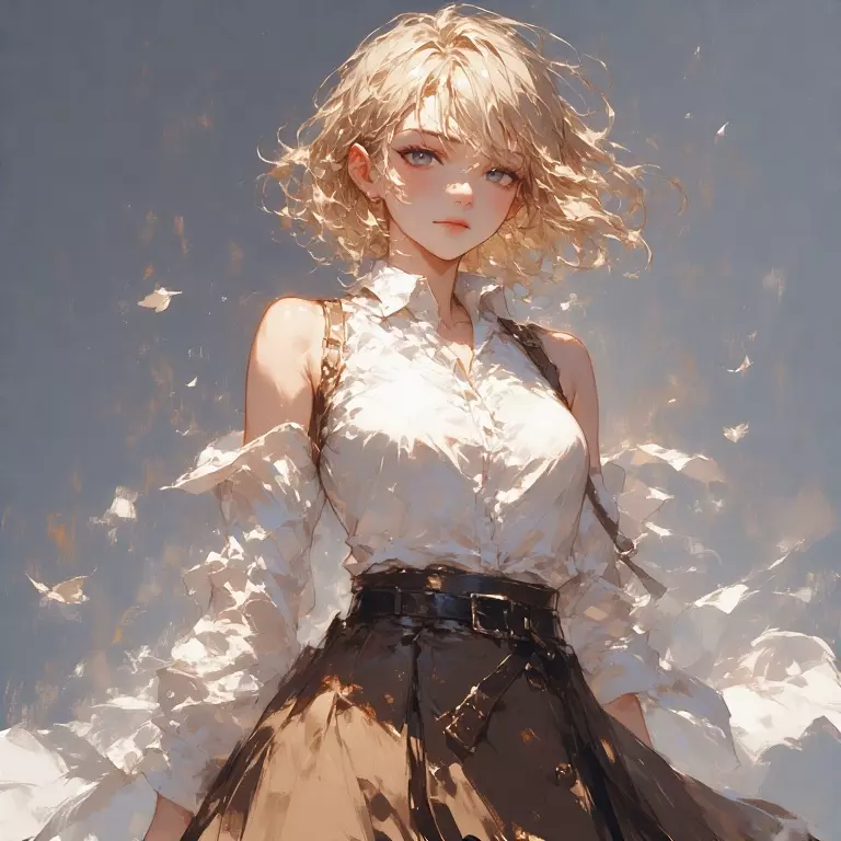 Appearance: Short blonde hair, frowning, sleeveless top, short skirt, petite frame, piercing blue eyes, often found with arms crossed over her chest