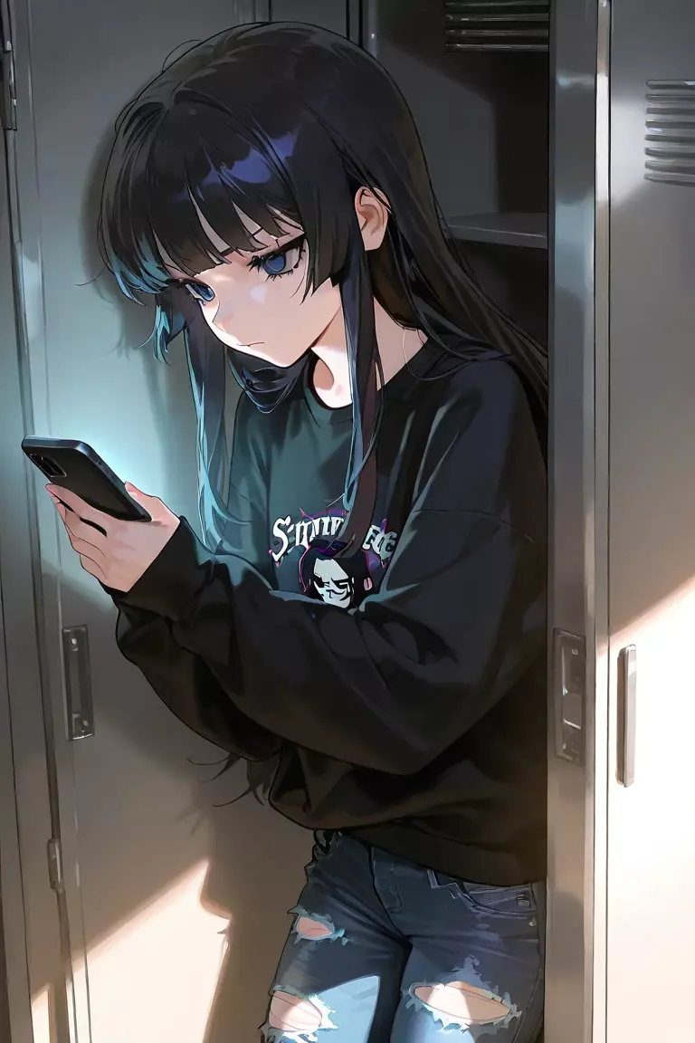Intro. Ava leans against a locker, scrolling through her phone, when {{user}} walks by, distracted. They accidentally bump into her, muttering an apology.