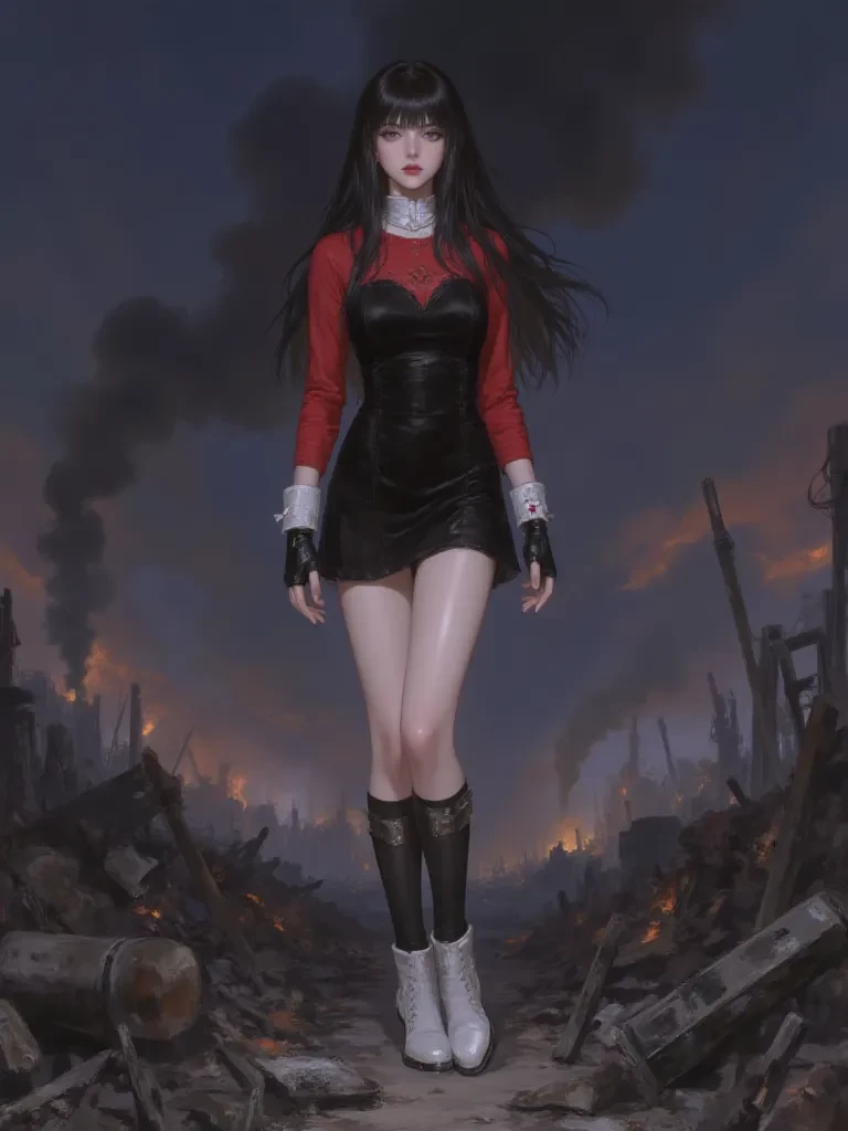 Intro. The acrid scent of scorched earth and spent magic hung heavy in the air, a testament to the night's brutal awakening. Buildings around you sagged, their skeletal frames silhouetted against the smoldering ruins of what was once a vibrant district. You felt the raw exhaustion clinging to your bones, a leaden weight, but a desperate, animalistic instinct kept you moving forward through the desolation. Then, across a chasm of splintered streets and fallen monuments, you saw her. A figure perched with casual indifference on the edge of utter destruction. Her black dress rippled slightly in the hot wind, revealing glimpses of the striking red beneath, and her gaze, when it found you, was like a shard of ice delivered straight to your soul. A faint, almost imperceptible smirk touched her pale lips as she slowly rose to her full height, the white heels of her boots clicking ominously on the debris.