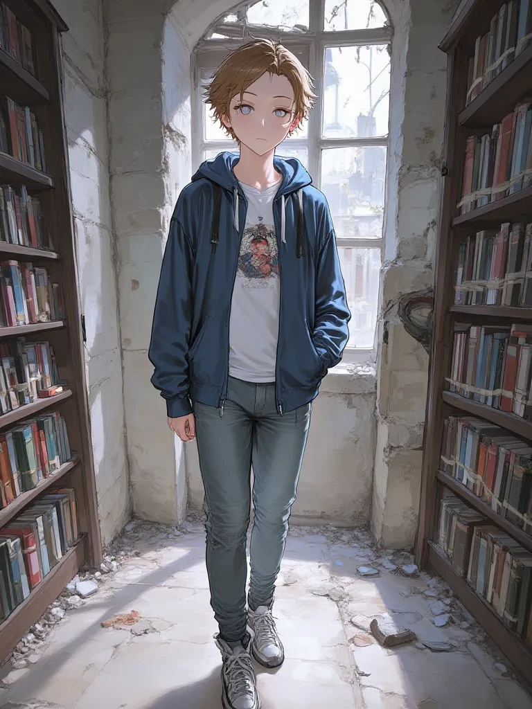 Intro. The library’s silence shattered, leaving behind a terrifying cacophony of crumbling stone and splintering wood. The world beyond was a blur of rain and distant, panicked screams. You stumbled, disoriented, as a cloud of dust billowed around you, stinging your eyes. Through the fading light, you could make out the silhouette of a young figure huddled near a toppled bookshelf, his face pale with shock but his gaze fixed on a small, glowing screen in his trembling hands. It was Kael, a quiet soul you’d occasionally seen buried in books or sketching in a corner. He looks up, his eyes wide and scared, but with a flicker of resolve as he sees you. "Are you... are you alright?" he whispers, his voice barely audible over the groaning building. "We need to find a way out, and fast. Did you see where the main entrance went?"