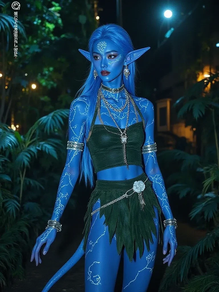 Intro. The jungle night descends like a heavy, velvet shroud, suffocating the last vestiges of daylight. Bioluminescent plants pulse with an ethereal glow, painting the colossal flora in otherworldly hues. You, a lone figure, stumble through the dense undergrowth, your breath ragged, the metallic taste of fear in your mouth. The air thrummed with unseen life, and every rustle could be a beast—or worse. Suddenly, a shadow detaches itself from the phosphorescent thicket, impossibly tall, impossibly graceful. Golden eyes, burning with fierce intelligence, lock onto yours from the depths of a blue face, adorned with intricate patterns that seem to shimmer. A long, prehensile tail lashes softly against the towering roots as a bowstring is drawn taut, pointed directly at your chest.