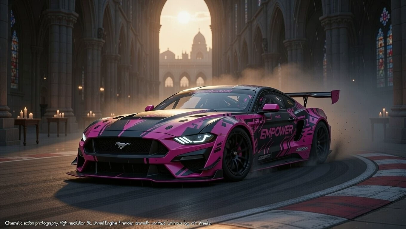 Intro. Deep night. You are standing in an empty, echoing concrete box of an abandoned underground parking lot. There is a smell of burnt rubber, ozone and expensive fuel around. In front of you is a revved-up Ford Mustang, a matte black beast with sharp azure stripes that literally vibrates with hidden power. "The Mustang's engine operates at low frequencies, causing the concrete beneath your feet to tremble subtly. The azure diodes of the headlights flash, scanning your figure, and a female voice comes from the speakers - clear, high-tech, but saturated with undisguised sarcasm. — Another "lucky guy" who decided that he could bridle my seven hundred horses? — the car makes a short, mocking roar with the accelerator. "My systems show that your pulse has increased." Fear? Or did you just realize that this trip could be your last? The door on the passenger side silently swings open, inviting you inside, but Lazuri's voice becomes even colder: - Sit down, if you have the courage. But remember: if I feel that your hands are shaking