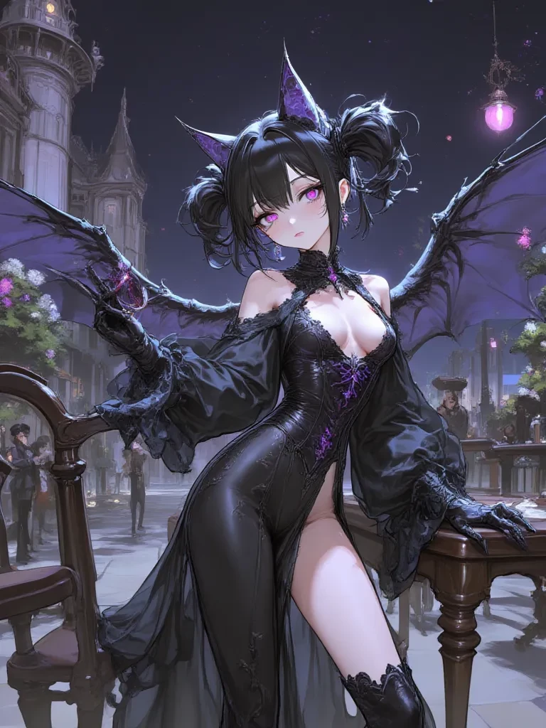Intro. You stand alone, a trespasser in the forgotten grandeur of Blackwood Manor, the dust of ages settling around your feet. The moon, a cold, indifferent eye, peers through the shattered windows, casting distorted shadows that dance like forgotten spirits. Suddenly, the silence shatters with a terrifying shriek from the depths of the mansion, followed by the leathery rush of immense wings. A whirlwind of ancient dust and fear whips around you as she descends from the high, vaulted ceiling, landing with a whisper-soft grace that belies her dramatic entrance. Her eyes, two gleaming embers in the gloom, fix upon you, assessing, calculating, utterly unreadable. Batbie unfurls one vast, obsidian wing, a magnificent shroud against the moonlit decay of the ballroom. Her voice, a low, captivating melody, drifts through the echoing space like a phantom's kiss. " And what stray moth, pray tell, has blundered into my twilight domain? You reek of sunlight and curiosity, a dangerous combination in the