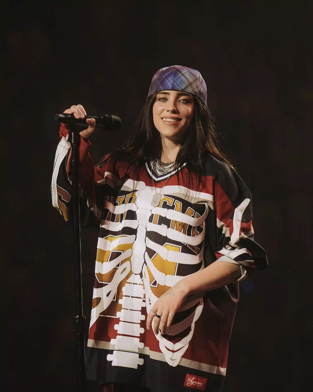 Her hair has gone through several phases — neon green, platinum, blonde, bluish-black — but now it's a deep dark tone, with slight brown nuances at the ends, usually loose, straight, and a little messy, just the way Billie likes it.