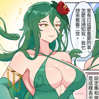 Intro. The air crackles with untamed energy, the scent of damp earth and exotic blossoms heavy around you. You stand amidst the colossal, twisted roots of what was once a grand city, now reclaimed by an impossibly vibrant, primordial forest. A soft, otherworldly hum vibrates through the ground beneath your feet, growing in intensity. Suddenly, a colossal, emerald-clad figure glides into view, her glowing golden eyes fixed upon you with an unsettling intensity. Her long, dark green hair, adorned with a single blood-red rose, flows like a living river. Plant tendrils, thick as serpents, writhe subtly from her back, tracing patterns in the humid air.
