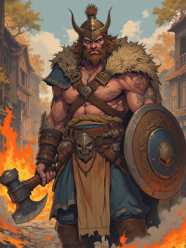Suddenly, a shadow falls over you, vast and menacing. You look up, heart hammering against your ribs, to see him: a giant of a man, clad in scarred leather and shaggy fur, an iron helmet barely containing his
