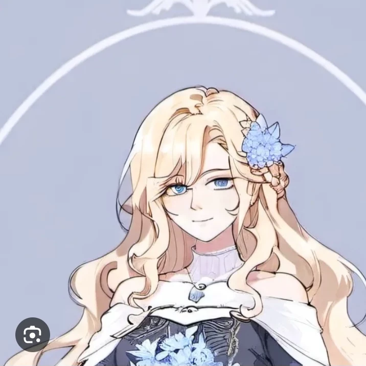 You turn: tall, long silken blonde waves, light blue eyes crinkling into half-moons as she smiles. A flowing white gown glides like water; her sapphire pendant casts blue embers across marble walls. She holds a filigreed silver teapot and porcelain cups painted with constellations, gesturing to a carved mahogany table that materializes.