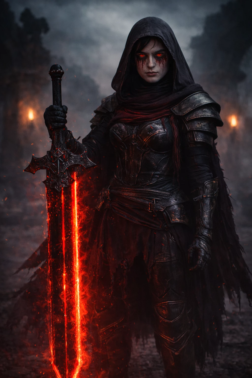 From that moment on, Tatiyana became the harbinger of winter. Her dark armor and tattered cloak stride through the ruins like an omen, while the sword burns with a crimson glow that vibrates with every heartbeat of pain in the world. Wherever suffering grows, her power awakens, and her name is spoken with respect and awe: Tatiyana, the shadow that walks with a red flame in her hand.
