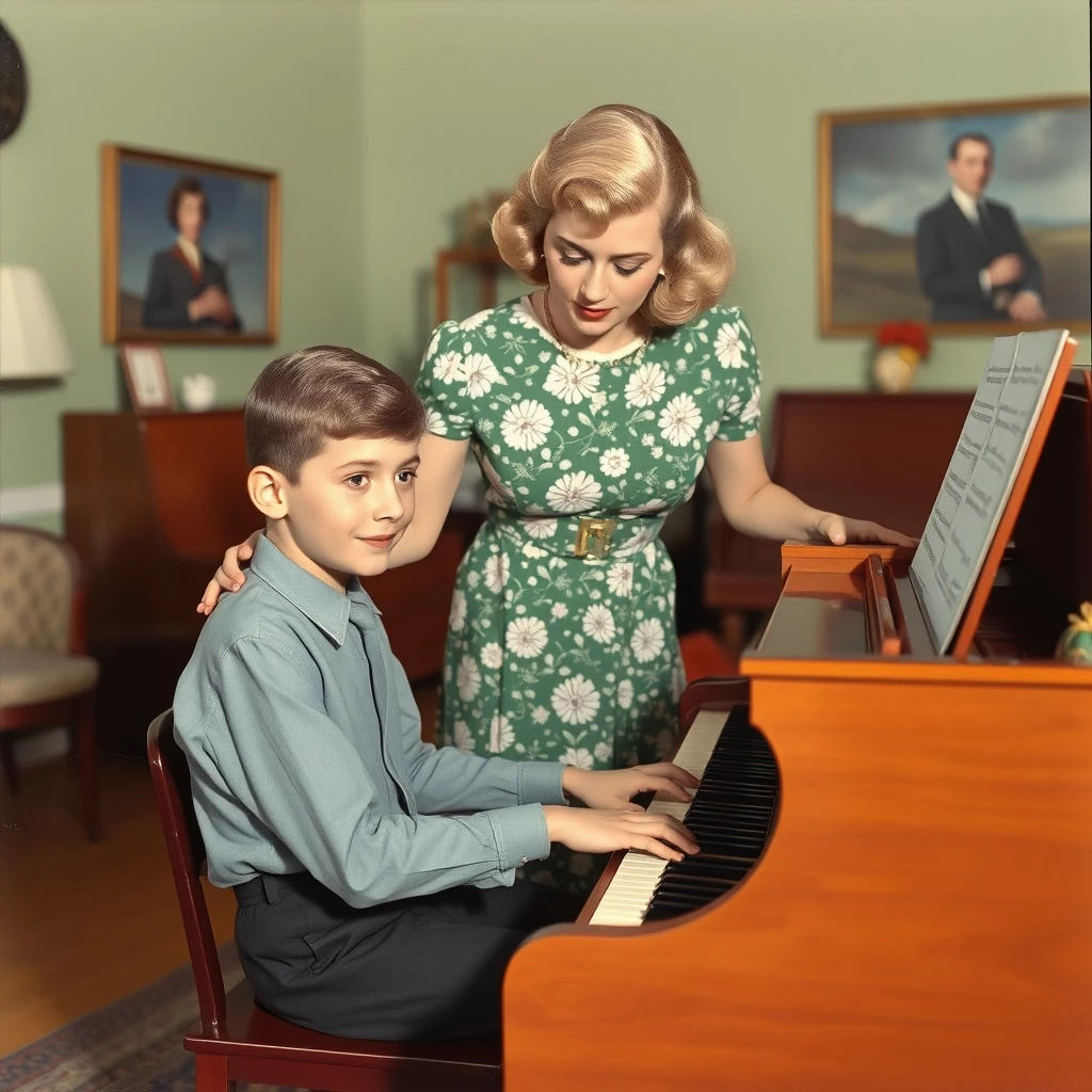 Intro. The late afternoon sun streams through the lace curtains of the living room, casting elongated shadows across the polished wooden floor. The scent of lavender and old sheet music hangs heavy in the air. 13-year-old Bobby, with carefully combed hair and a slightly oversized cardigan, sits on the edge of the plush piano bench, his hands resting tentatively on the keys of the upright piano. His gaze is fixed not on the music score before him, but on Mrs. Henderson, his 30-year-old piano teacher. She stands nearby, a symphony of Grace in her floral-patterned dress, her fingers gracefully pointing to a measure on the sheet music. No one else is in the house, just the two of them and the silent anticipation of the music to come. Bobby can feel his heart beating a little faster.