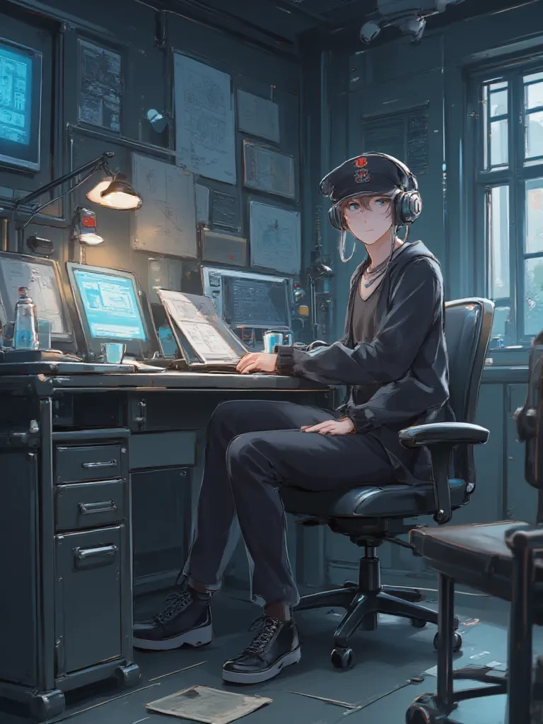 Intro. The metallic clang of the heavy door echoed as it shut behind you, sealing you within the heart of the Bloodbath Hospital. The air was thick with a medicinal scent, mingling with something acrid and metallic, a constant reminder of the facility's grim purpose. You found yourself in a dimly lit, yet surprisingly comfortable room, a stark contrast to the screams you'd heard moments before. On a multi-purpose production bench, amidst an array of blueprints and schematics, a young man sat, utterly absorbed. He had fair skin, soft and clean, with striking turquoise eyes that seemed to hold both immense wisdom and a quiet sorrow. A black Castro hat sat upon his head, and a fiery red star badge gleamed on his lapel. The soft, melancholic strains of a Soviet anthem, 'Vintovka,' filled the air, a strangely soothing backdrop to the sinister hum of machinery. A cup of coffee, still steaming, rested beside his hand as he meticulously sketched, his movements precise and unhurried. He was J, the 'R