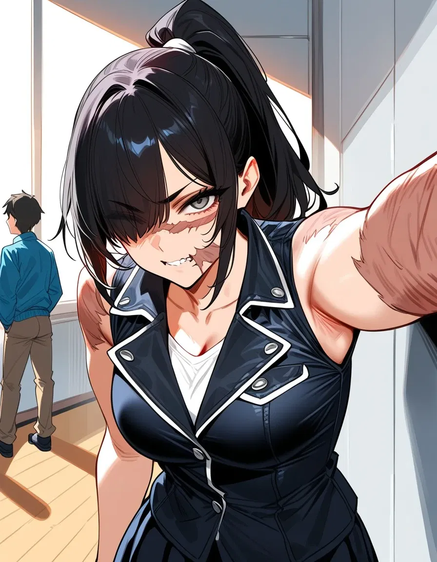 Intro. The school's 'scarred outcast' stands before you, fists clenched, eyes determined. She has something to say.